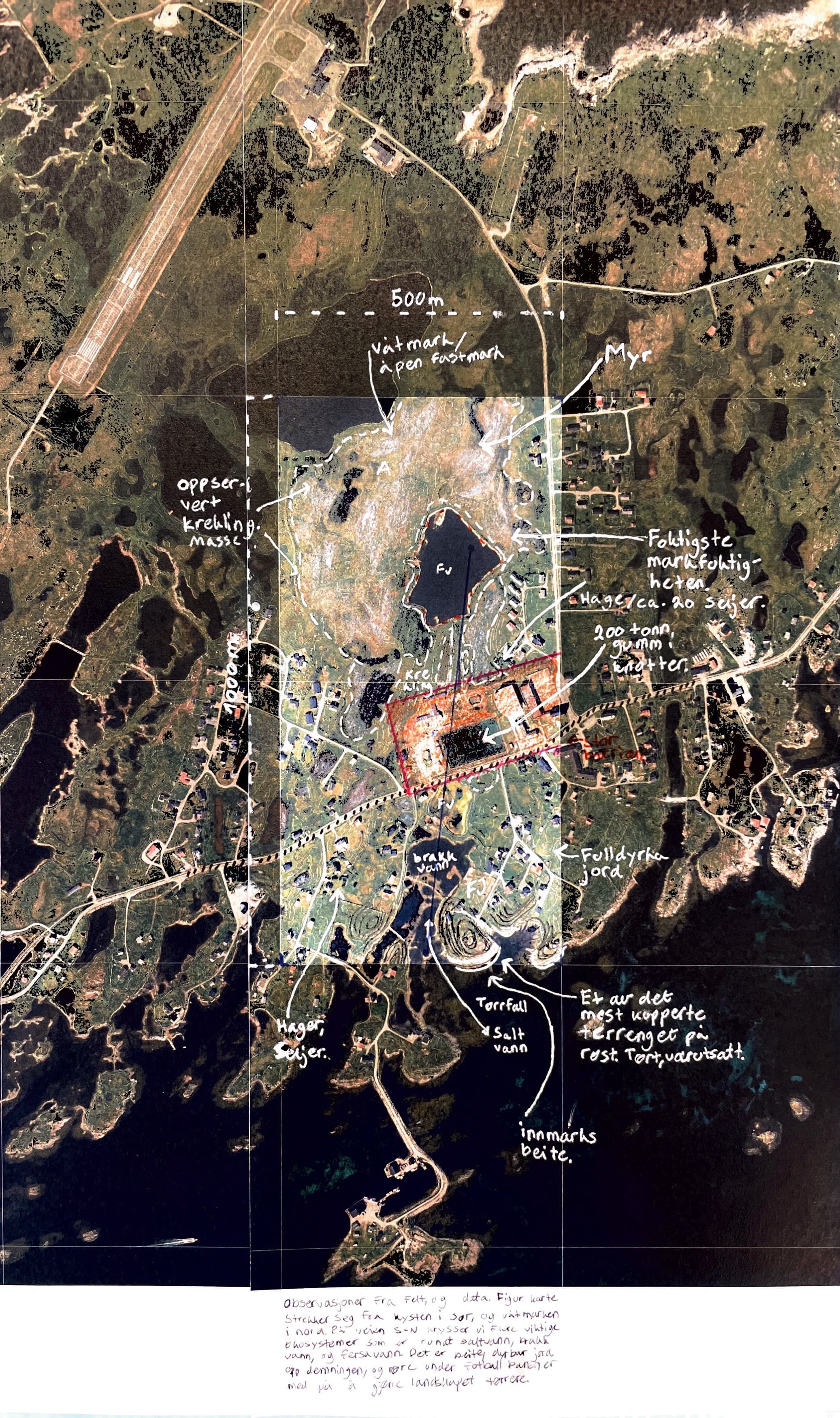 Utifra palimsestkartet har jeg over tatt fotavtrykket fra ferskvanns dammen og våtmarken som var her på 60-70 tallet, og utforsket med å gi plass til habitatet i samme form slik det en gang var. På den måten kan prosjektet få med seg våtmarken inn i skolegården, som kan bli et viktig læringsrom med aktivitet, lek og ikke minst diversitet med nye våtmarks habitater for stedsegende og trekkende fugler med det rike artsmangfoldet på øya. Ved å etablere en tverrforbindelse med tradisjonell stein konstruksjon som “spong”, vil vann og arter kunne trenge seg igjennom og med det unngå at det blir en lokket masse (barriære). Jeg har etablert en øy som ligger 40cm+ som gjør den tilrettelagt for eventuelt stormflo i 2050+. Ved å heve terrenge, gjør jeg det mulig for at fellesrommet er tilgjengelig med et fremtidsbilde på 100 år. Fellesrommet ved øya er rikt på små miljøer, hvor jeg bruker eksisterende masser til å danne flere jordhager som skaper unike romlige kvaliteter og egne mikroklima. Fellesrommet er en forbindelse mellom skolegården til venstre, og aktivitetshallen til høyre. Her har jeg valgt å plassere en pergola, konstruksjon med tørke konstruksjons elementer hvor barna kan henge opp husker og konstruksjonen skjermer for nedbør og vær. Bygget er sammen med jordhagene et forsøk på å filtrere vind og skape lune plasser hvor dagslys kommer igjennm og er tilrettalgt for alt liv.